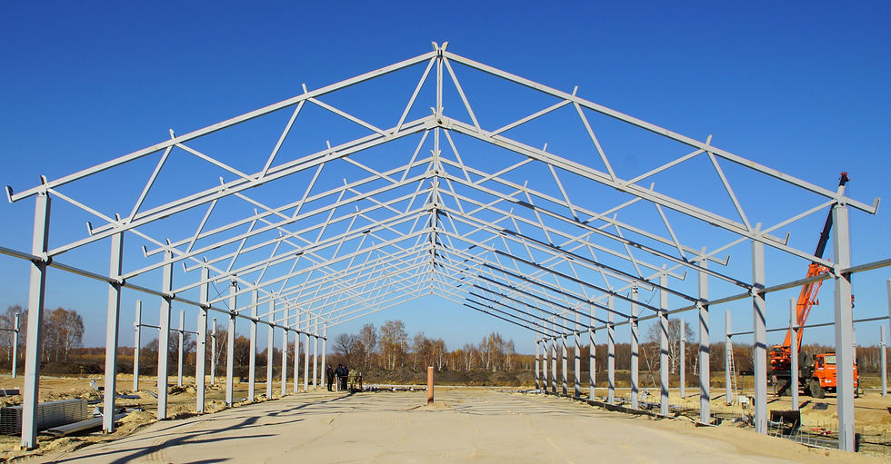 Схема работы данного каркаса - стоечно-балочная. На колонны защемленные в фундаменте опираются треугольные фермы покрытия, по фермам покрытия прокинуты прогоны покрытия. Каркас полностью состоит из профильной трубы квадратного и прямоугольного сечения. Сборка каркаса ведется на круглых шпильках (фермы, колонны) и самонаризающих винтах (прогоны покрытия, стеновые прогоны). Для конструкций применялась низколигированная сталь повышенной прочности.
